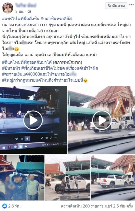 เป็นโพสต์ที่ได้รับการแชร์อย่างหนัก เมื่อสมาชิกเฟซบุ๊กรายหนึ่งได้โพสต์ภาพและคลิปจำนวนมาก โดยระบุว่า พี่ชายของตนเองโดยคนกลุ่มหนึ่ง ใช้อาวุธปืนมาขู่และจับตัวไปซ้อม แต่สุดท้ายอ้างว่า เข้าใจผิดและจะจ่ายเงินให้เพื่อจบเรื่อง โดยโพสต์ดังกล่าวได้รับการแชร์จำนวนมาก