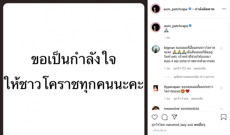 เเละล่าสุด ซุปเปอร์สตาร์เบอร์หนึ่งเมืองไทยอย่าง อั้ม พัชราภา โพสต์เเล้ว หลังทหารก่อเหตุกลางเมืองโคราช โดย อั้ม พัชราภา นั้นได้ส่งกำลังใจถึงพี่น้องชาวโคราช โดยได้โพสต์ผ่านทางอินสตราเเกรม ระบุข้อความว่า ขอเป็นกำลังใจให้ชาวโคราชทุกคนนะคะ